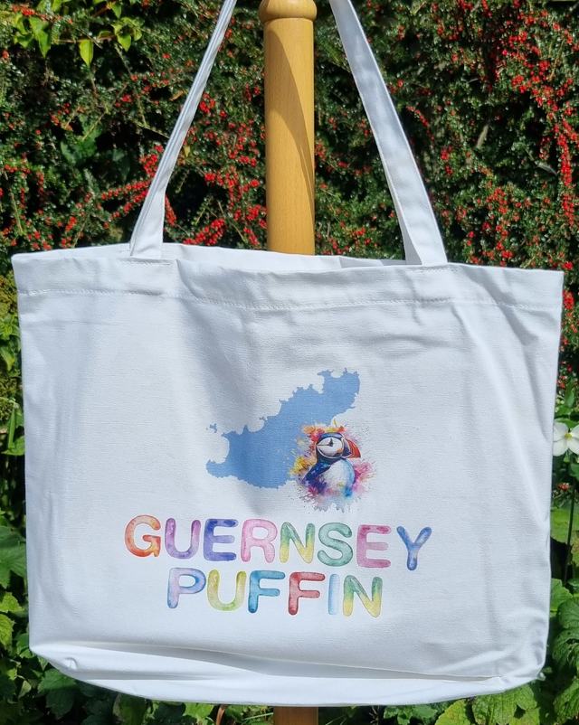 40cm x 40cm bag 100% cotton white shopper bag with Guernsey Puffin design on front and map/puffin design on reverse